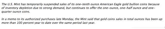 « La US Mint vient d’annoncer une interruption de la vente des pièces d’ 1/10 d’once d’or. La déconnexion entre or « papier » et or « physique approche sa phase terminale.